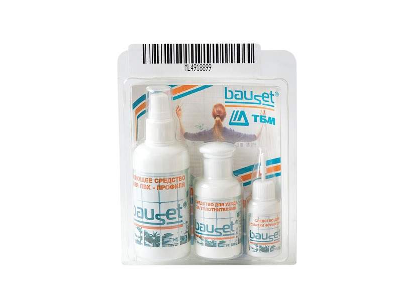 Набор для ухода за окнами включает в себя моющее средство для поливинилхлоридного (ПВХ) профиля, откосов и подоконника (100 мл), средство для ухода за резиновыми (силиконовыми) уплотнителями (50 мл), средство для смазки подвижных частей фурнитуры (18 мл) и многоразовую салфетку из нетканого материала.